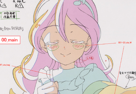 仕上は、アニメーターが描いた線画に色を塗る彩色工程を担います。彩色工程でスピードや技量を身につけていただいた後、塗り上がりの不備等を検査する仕上検査、シーンカット毎に色を指定する色指定へと業務の幅を広げていきます。 経験により得た技術やセンスが評価されると、色彩設計を担当するようになります。色彩設計とは、作品の雰囲気や世界観、監督のイメージなど全体のバランスを考えながらキャラクターの色を決め込んでいく仕事です。