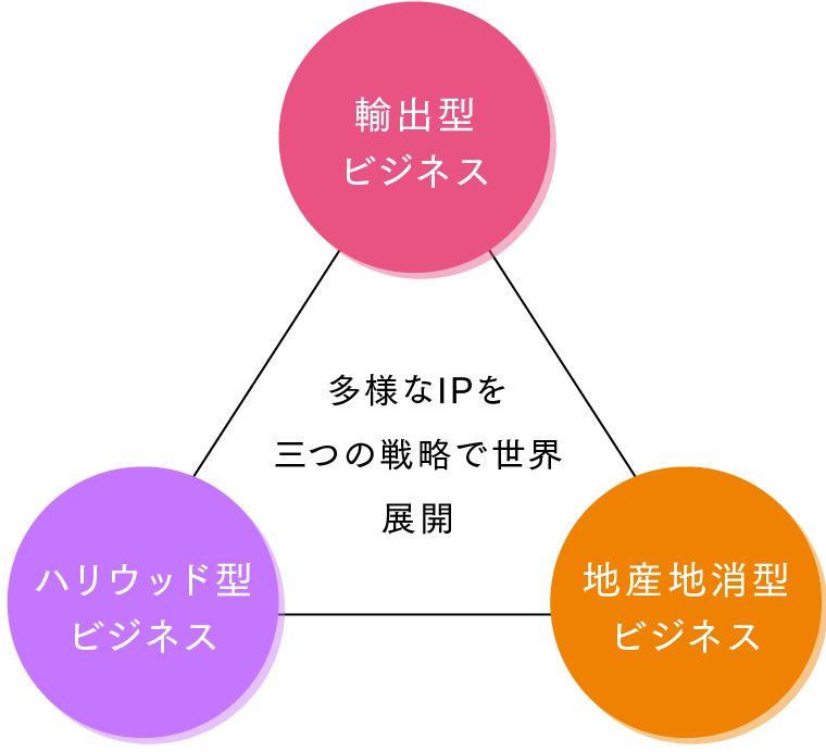 グローバル市場の今後の開拓にあたり、「輸出型ビジネス」「ハリウッド型ビジネス」「地産地消型ビジネス」の三本柱でビジネスを展開していきます。