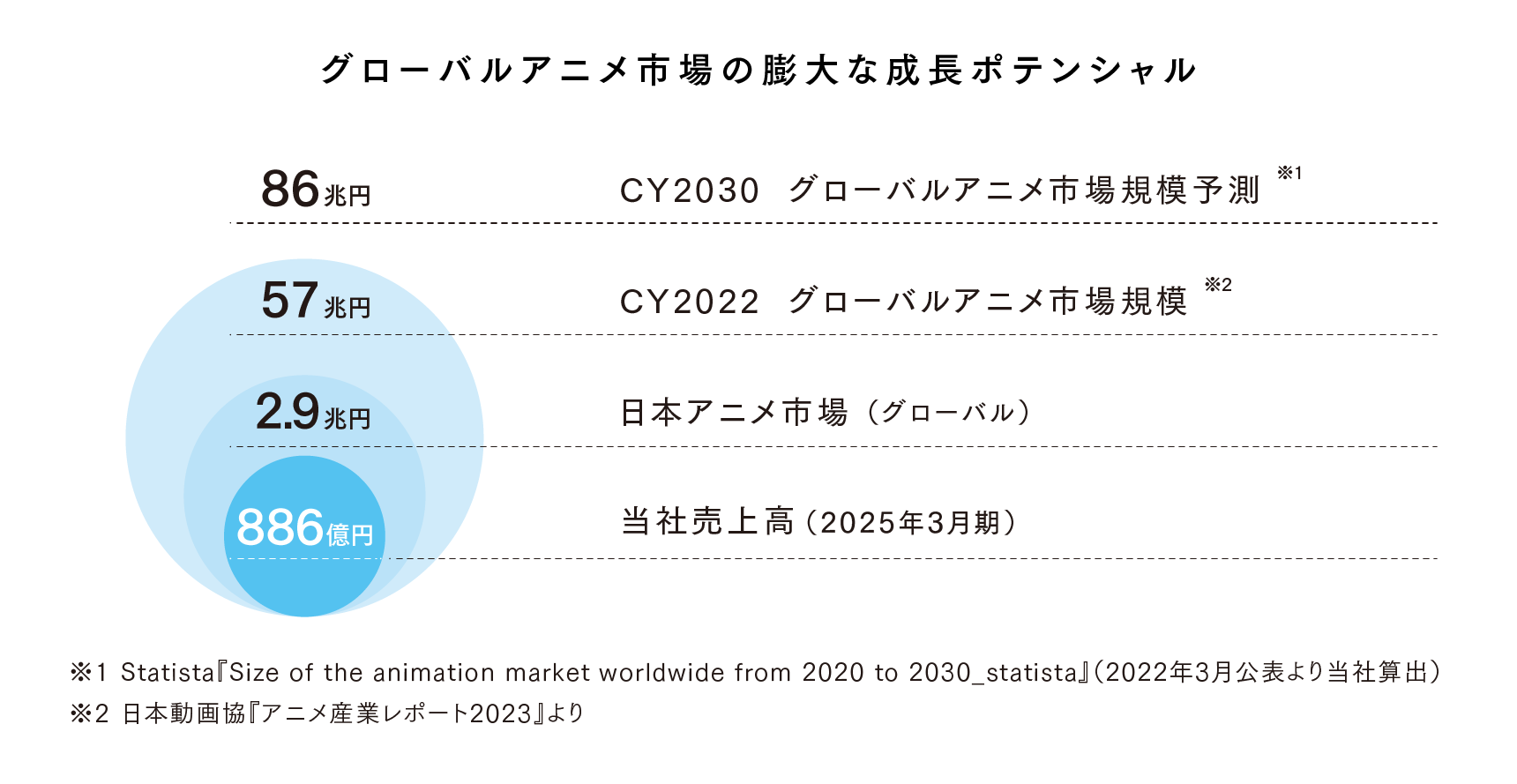 拡大し続けているグローバルアニメ市場は2030年には約86兆円規模となる予測です。その大きな市場に向けて、当社がこれまでに培ってきた強みを活かし、今後も展開を強化していきます。